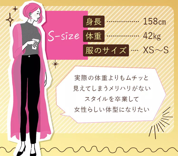 Sサイズを選ぶ女性の着用イメージは、たとえば、身長が158cmで体重42Kg、服のサイズは