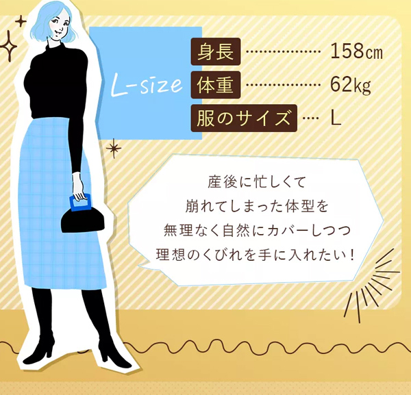 Lサイズを選ぶ女性の着用イメージは、たとえば、身長が158cmで体重62Kg、服のサイズは