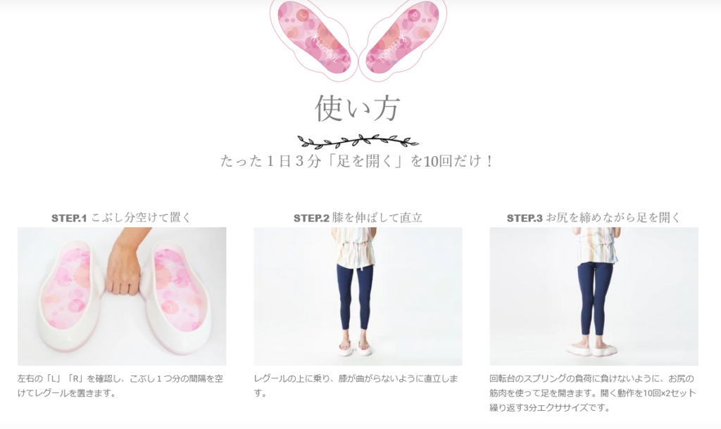 毎日3分×10回のトレーニングだけで、骨盤の歪みが改善され、かつ美脚も目指せるのは嬉しい機能ですよね。