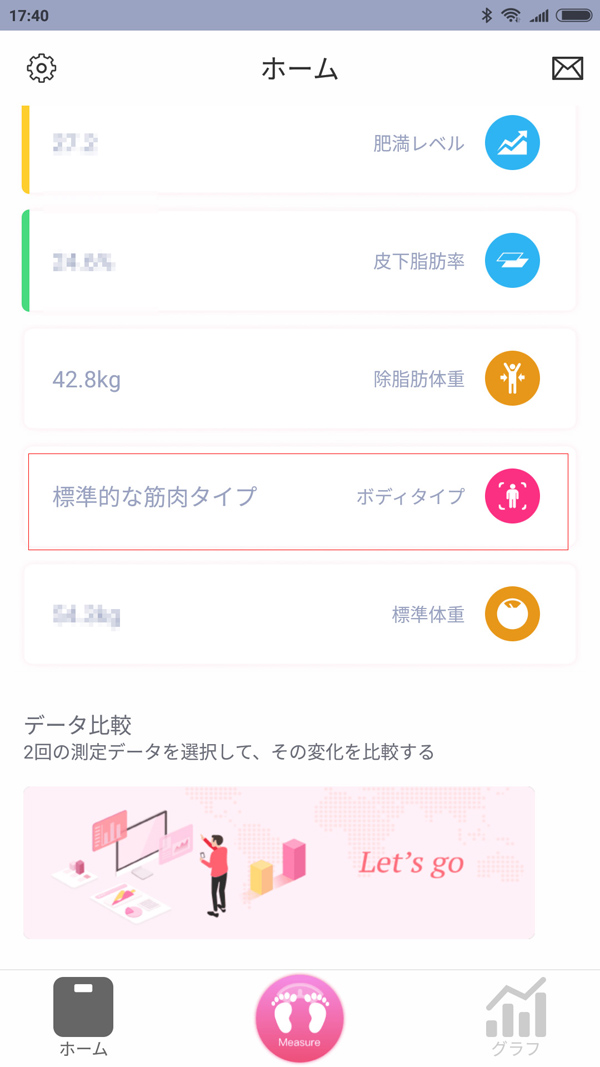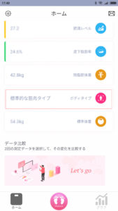 で、アプリで個人データを入力して、体重計に乗ったら、驚くほど色々なデータがわかるものなんですねー。